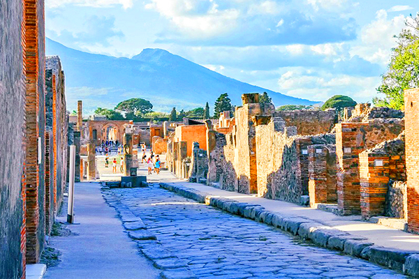 庞贝古城:是一座背山面海的避暑胜地,始建于公元前6世纪,公元79年毁于维苏威火山大爆发。从1748年起考古发掘持续至今,为了解古罗马社会生活和文化艺术提供了重要资料。古城遗址内,参观昔日之市政广场、会堂、神庙、体育场、澡堂、旅馆、竞技场及妓院等建筑。